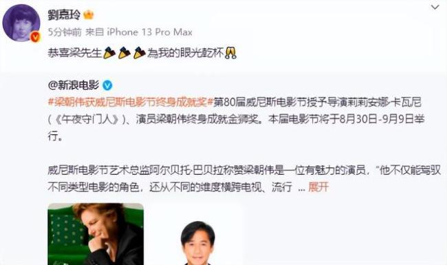 【梁朝伟获威尼斯电影节终身成就奖 ,刘嘉玲得意发文】3月27日,梁朝伟获得了威尼斯电影节终身成就金狮奖。