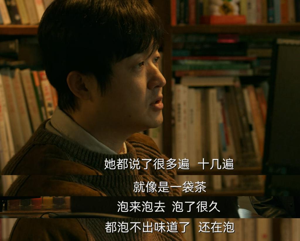 包贝尔饰演小夏的朋友,警察问他话,他回答完之后非要附上一句比喻句—— " 她说了很多遍,就像是一袋茶,泡来泡去泡了很久,都泡不出味道了,还在泡 "。