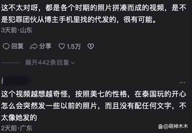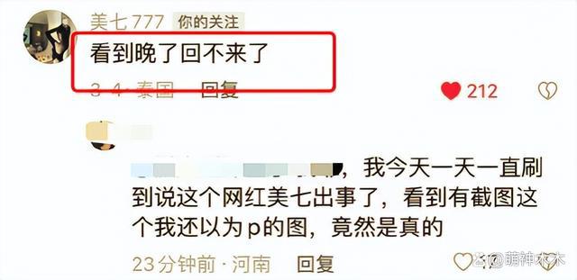就在这条动态之后,美七开始失联,社交平台断更,直到最新的报平安视频。值得注意的是,在前段时间各大网红都在讨论泰国旅游安全时,美七曾评论过:看到晚了回不来了。当时人们没觉得有问题,但是结合现在的情况来看,这条评论是否是她在求救呢?