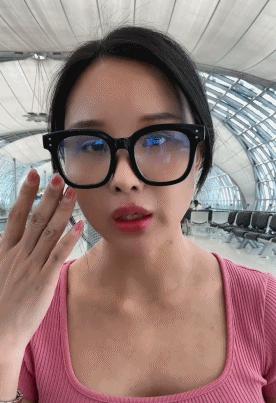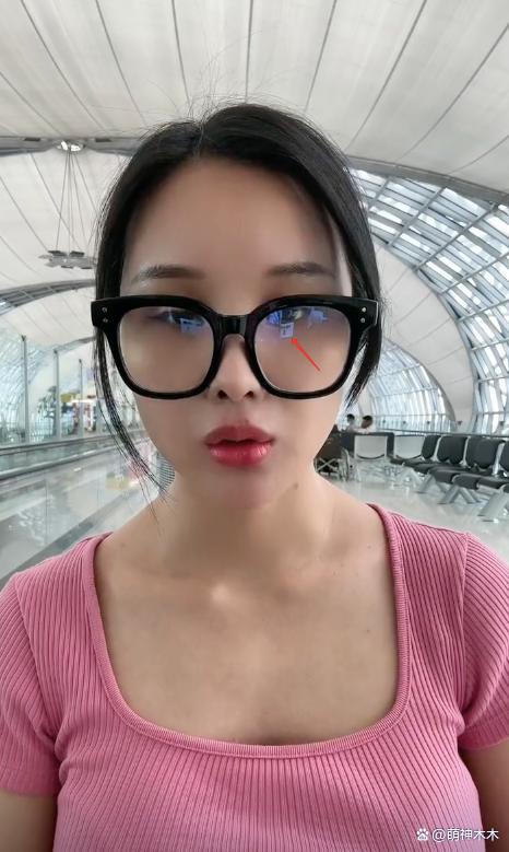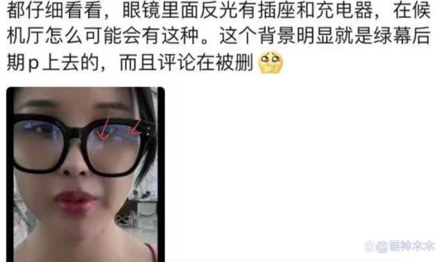 有网友仔细观察了一下美七,发现从她眼镜中能看到有插座和充电器。但是在候机厅是没有这些东西的,疑似这个视频并非是在机场录的,而是后期绿幕 p 上去的。