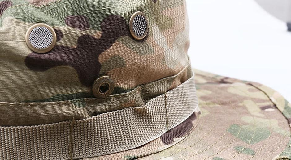 此外,奔尼帽的帽顶部分采用了防水材料,确保在恶劣天气下仍能保持良好的状态。其上的线绳可以在应急情况下用来当做引火材料、固定材料等,在缺少物资的情况下起到应急作用。通过在帽圈部分插上一些植被——每个军用奔尼帽上都有一个帽圈,有多个插口,从而提高隐蔽性。