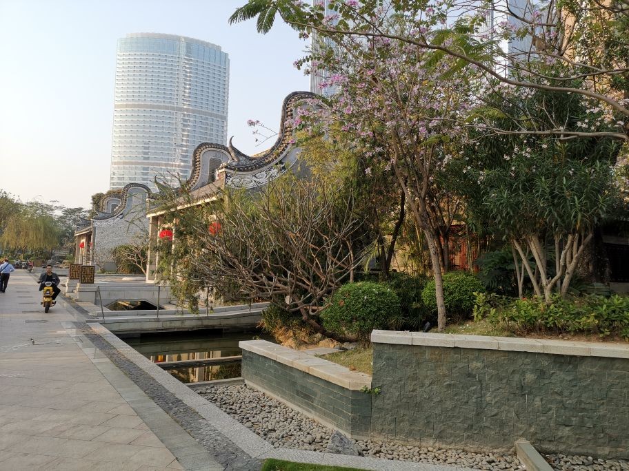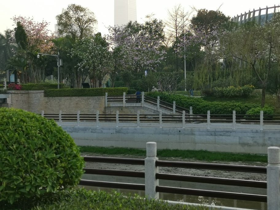 这是猎德涌(即小河)岸边。绿树红花,两岸装点的美仑美奂。