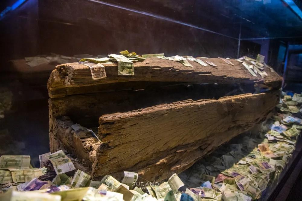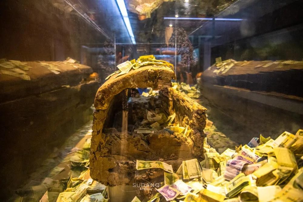 该展厅内有一副大的悬棺、两幅小的悬棺以及遗骨。其中,小的悬棺则是二次葬悬棺。据工作人员介绍说有几百年的历史。但大的悬棺却是上千年了,约有两千多年。游客见“棺”发财,千年悬棺的玻璃保护罩内留下了无数纸币。