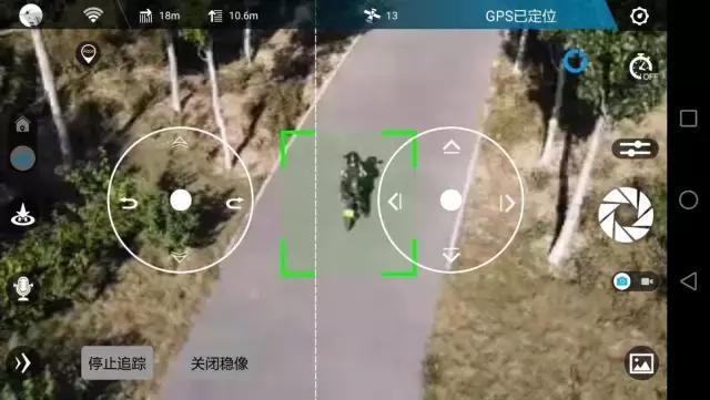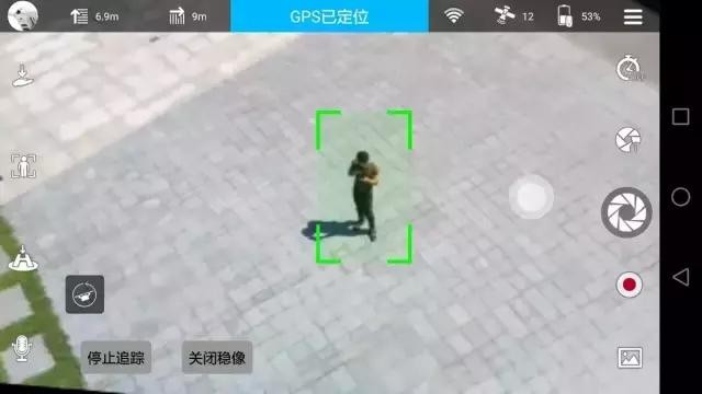DOBBY进行自动跟随前,需要手动将摄像头调整到-45°的角度,并将飞机拉升到5米以上高度。此时,如果卫星数量大于10颗,便可以激活自动跟随。操作者只需在手机端框选拍摄对象,点击开始跟随DOBBY就会自动追随拍摄对象,并始终保持拍摄对象位于屏幕中央。