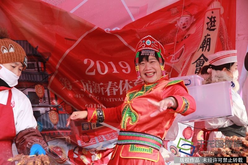 2019年2月5日至9日,第二届新春体育庙会在北京国际雕塑公园举行。本届庙会设有有冰壶球、冰车、雪地摩托、滑雪等冰雪运动项目。图为2月8日,庙会上身穿民族服装的摊贩表演民族舞蹈表演。千龙网记者孙迟摄