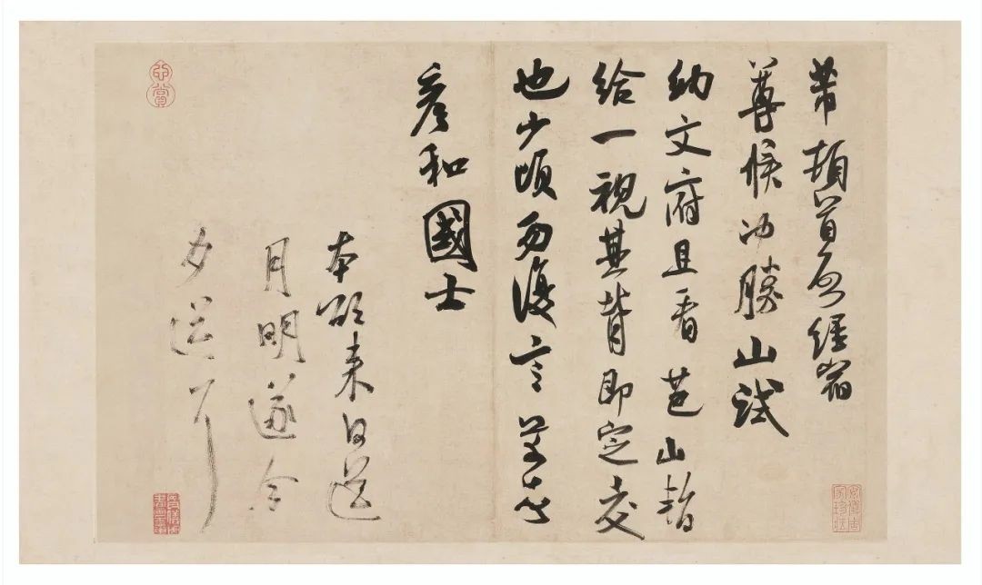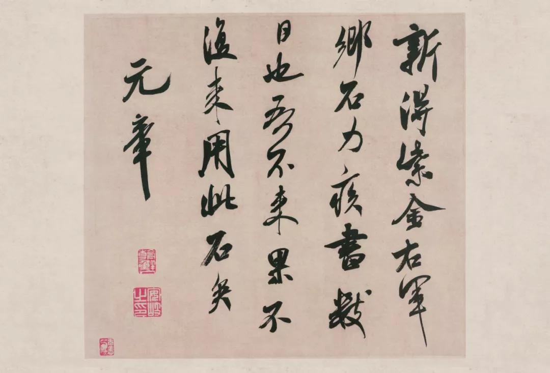 因是信札,米芾写来十分随意,但扎实的功力使这件小札也体现了用笔迅疾、力沉奇倔,欹侧取势而无霸气,转折间多机巧锋芒,笔势放的开,收的住,可谓随心所欲而不逾矩。