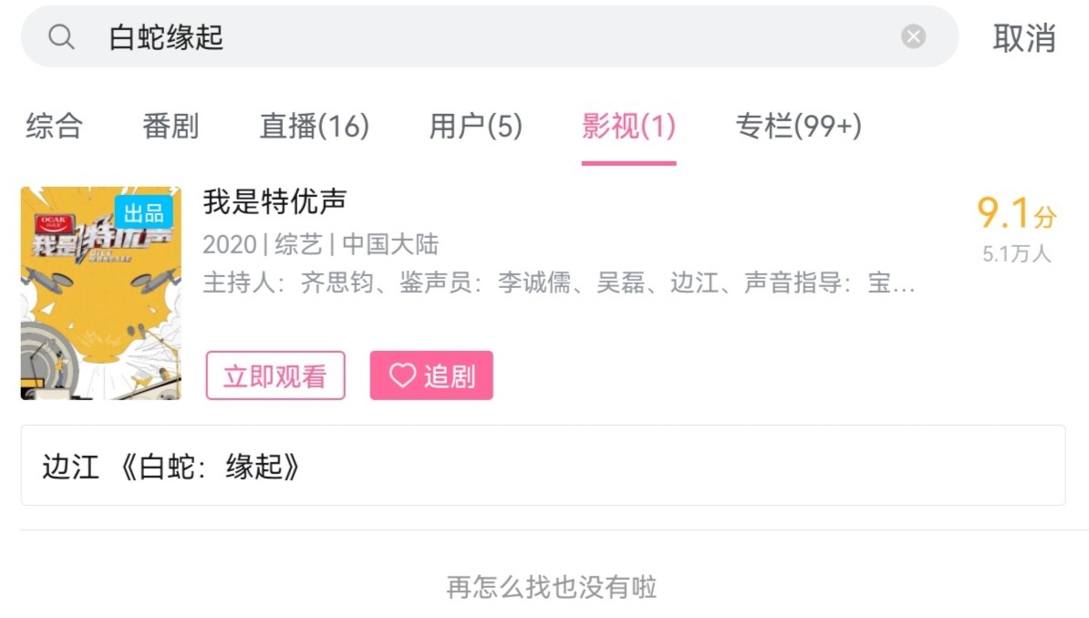 现在在某站输入《白蛇缘起》的名字,就会发现影视那一栏已经没有了它的身影。只是因为《我是特优生声》的其中一期提到《白蛇缘起》,所以才会显示“影视(1)”,点进去是找不到动画电影的。《白蛇缘起》下架得悄无声息,咱们在《青蛇劫起》的评论区抽丝剥茧,可以知道它大概是3月5号前后下架的。