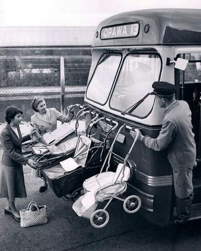二四、20世纪50年代,新西兰奥帕瓦的婴儿车被绑在公共汽车前面,成为了街头一道独特的风景线。
