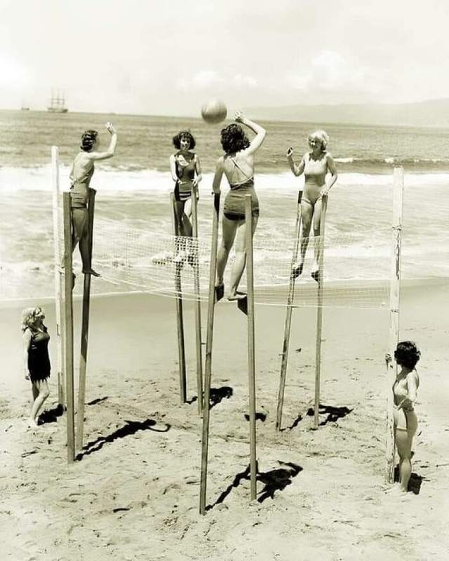 八、1934年,美国,加利福尼亚州威尼斯海滩上,四名年轻女性在踩高跷上打排球。