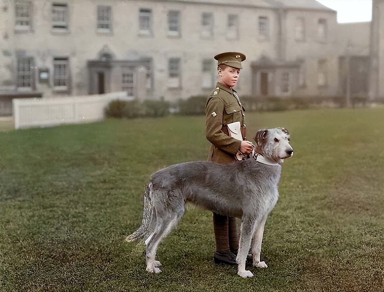 二十、1917年2月21日,爱尔兰卫队乐队的小鼓手与吉祥物爱尔兰猎狼犬在水福德军营合影留念。