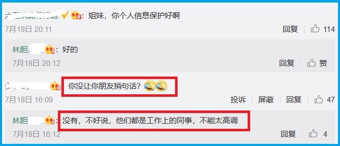 博主回道:“没有,不好说,他们都是工作上的同事,不能太高调。”