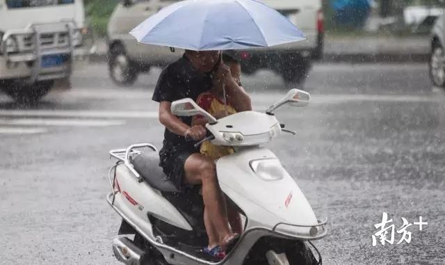 △呵护--一样在雨天,一位父亲一边骑车,一边单手把小儿子紧紧搂在怀里。