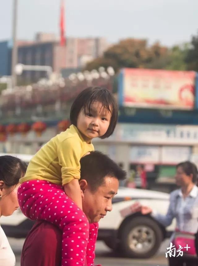 △坚持--广州火车站广场,一位父亲正顶着自己的女儿前行。脸上的汗珠不停滴往下滴。