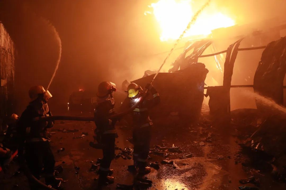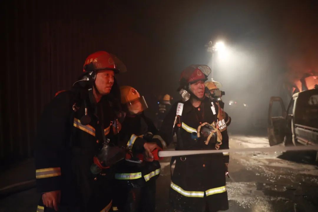 夜黑风大,寒气袭人,消防指战员冲进烟雾和毒气中展开灭火战斗。由于彩钢板库房坍塌后,水枪难以触及火点,指挥中心立即调派重型工程机械救援大队指战员到场,协助破拆灭火。同时竖起大型照明组,用于火场照明。