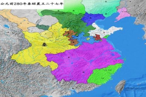 公元前280年,秦昭襄王派司马错攻楚,占领了楚国的黔中郡。楚国被迫割上庸及汉水以北地给秦。同年,秦将白起攻打赵国,攻占代,光狼后,乘胜攻打楚国,攻占郢都。从地图上看,此时的秦国已显示出了一统天下的气势。