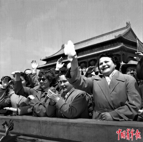 1956年5月1日,几名外宾在天安门观礼台上招手致意。中青报老照片