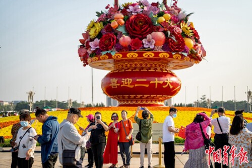 9月28日,天安门广场,人们在“祝福祖国”巨型花果篮前游览、拍照。篮体南侧书写“祝福祖国”“1949-2022”字样,篮体北侧书写“喜迎二十大”字样,庆祝即将到来的国庆节,喜迎党的二十大胜利召开。中青报·中青网记者 李隽辉/摄