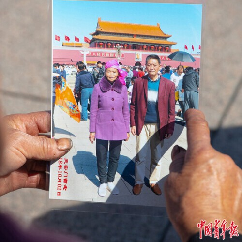 2018年10月2日,一名从外地来北京的游客拿着他们在天安门前刚拍的合影。中青报·中青网记者 李隽辉/摄
