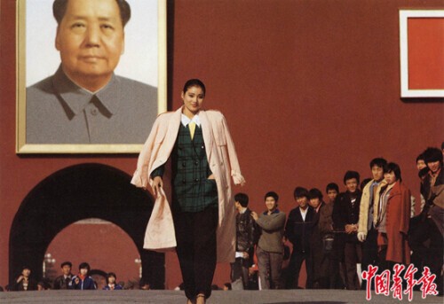 1988年11月24日,新中国历史上第一位国际模特大赛冠军彭莉在天安门金水桥走秀。刘占坤/摄