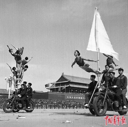 1959年10月1日,国庆10周年群众游行,体育表演的车队经过天安门广场。中青报老照片