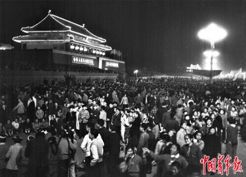 1961年10月1日晚,北京天安门广场,国庆节群众大联欢。新中国成立后,矗立在北京城中心已600多年的天安门,见证了无数大国内政外交的重要瞬间,也成为中国人时代记忆中熟悉的背景和坐标。中青报老照片