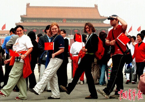 2001年4月29日,几名来自国外的游客在天安门前合影留念。中青报·中青网记者 李建泉/摄
