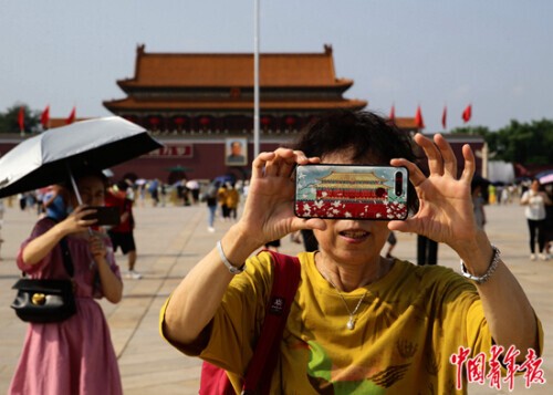 2021年7月16日,天安门广场,一名游客用手机拍照留念。手机壳上故宫城楼的图案与其背后天安门城楼相映成趣。中青报·中青网记者 陈剑/摄