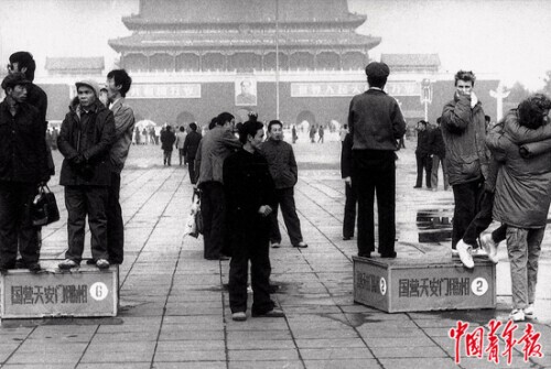 1987年11月,天安门广场,人们站在供游客照相的台子上观望。郑鸣/摄