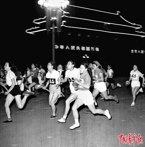 1960年5月4日,五四接力赛选手跑过天安门广场。铁矛/摄