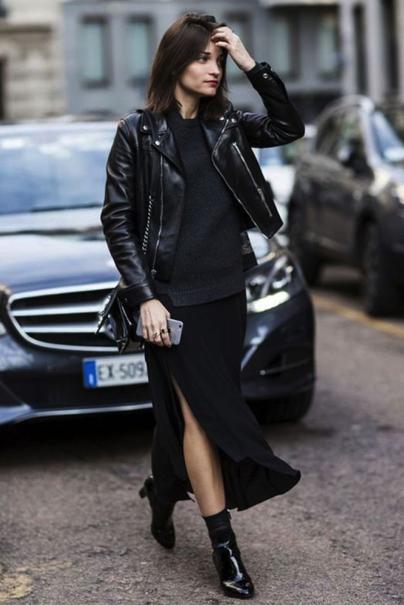 黑色皮夹克搭配长裙也是一个不错的选择,天气变凉也可以穿上厚厚的连体袜,兼顾风度与温度。