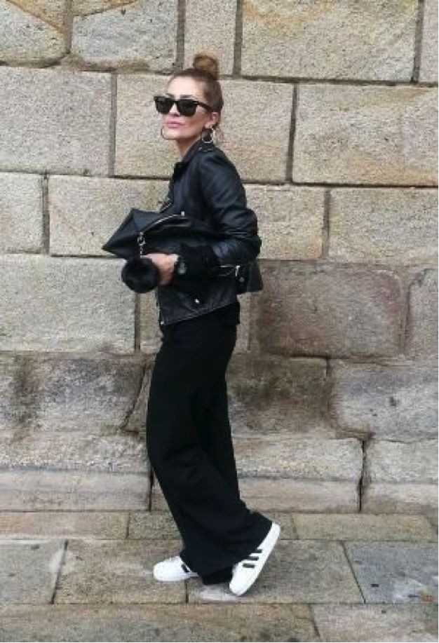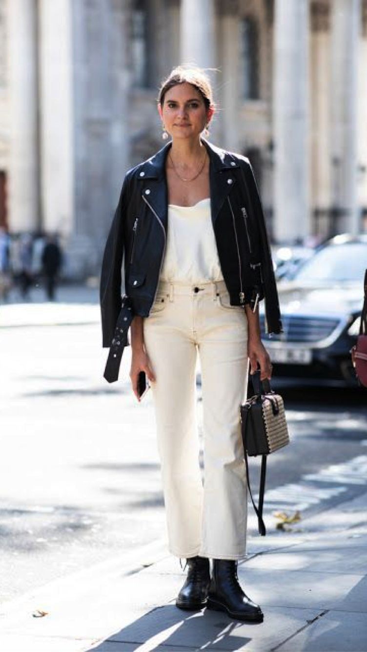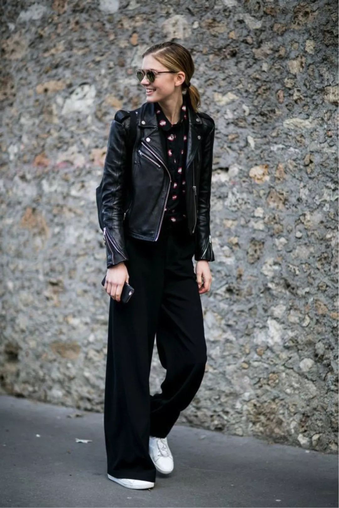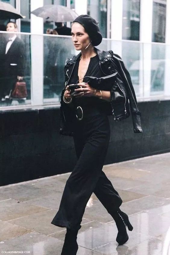 黑色皮夹克搭配高腰阔腿裤,再软的妹子也会立马攻气十足。