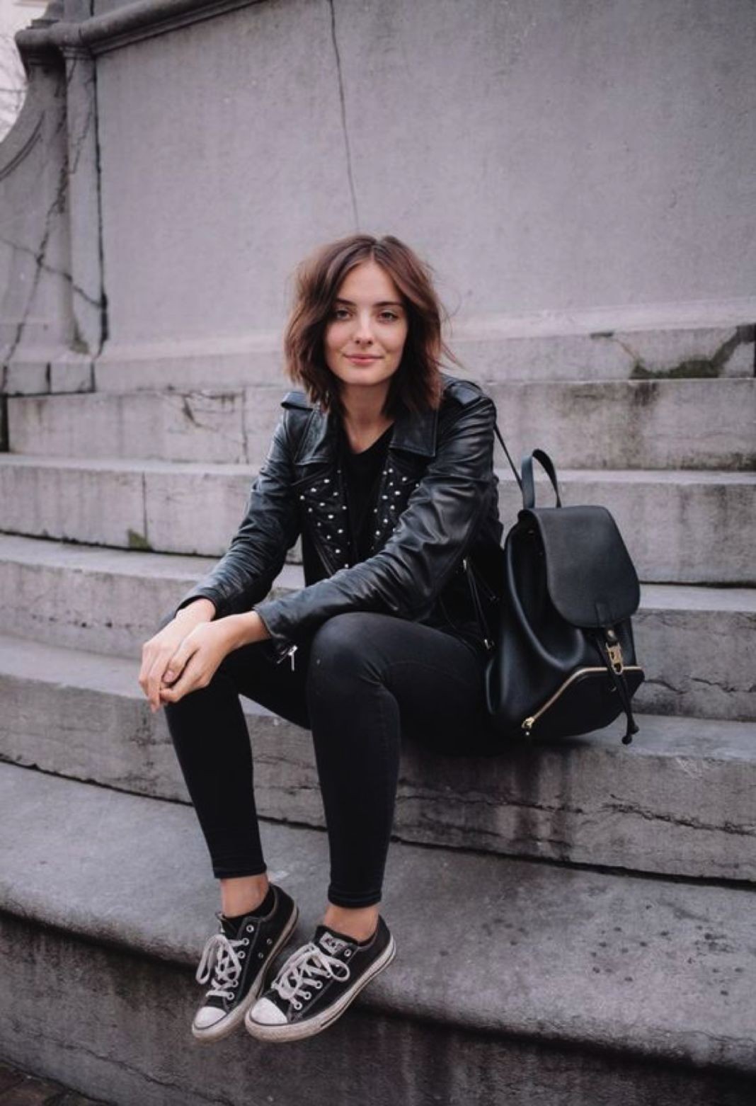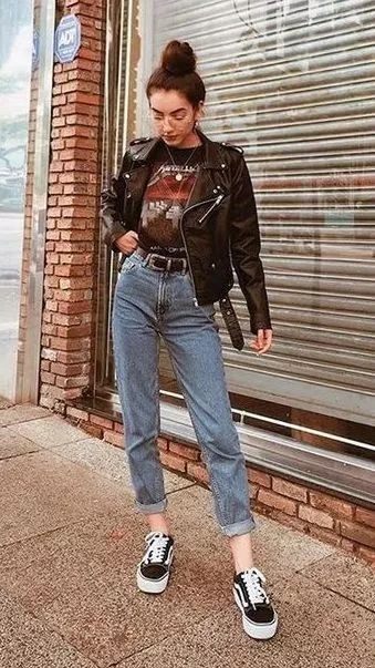 /// 黑色皮夹克+平底休闲鞋