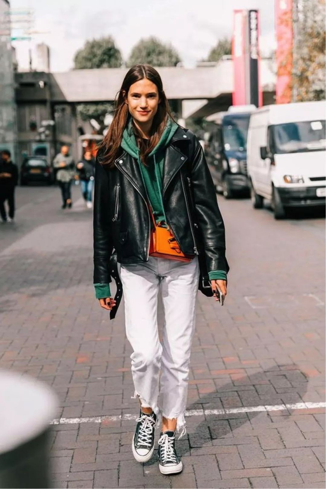 如果实在太冷,选择一款稍微宽松一点的皮夹克,里面穿一件hoodie,既抗风又暖和。