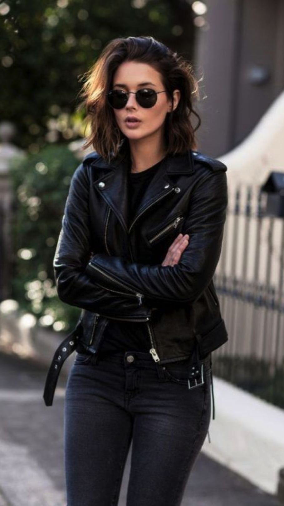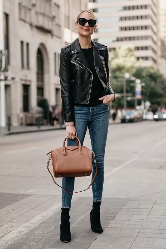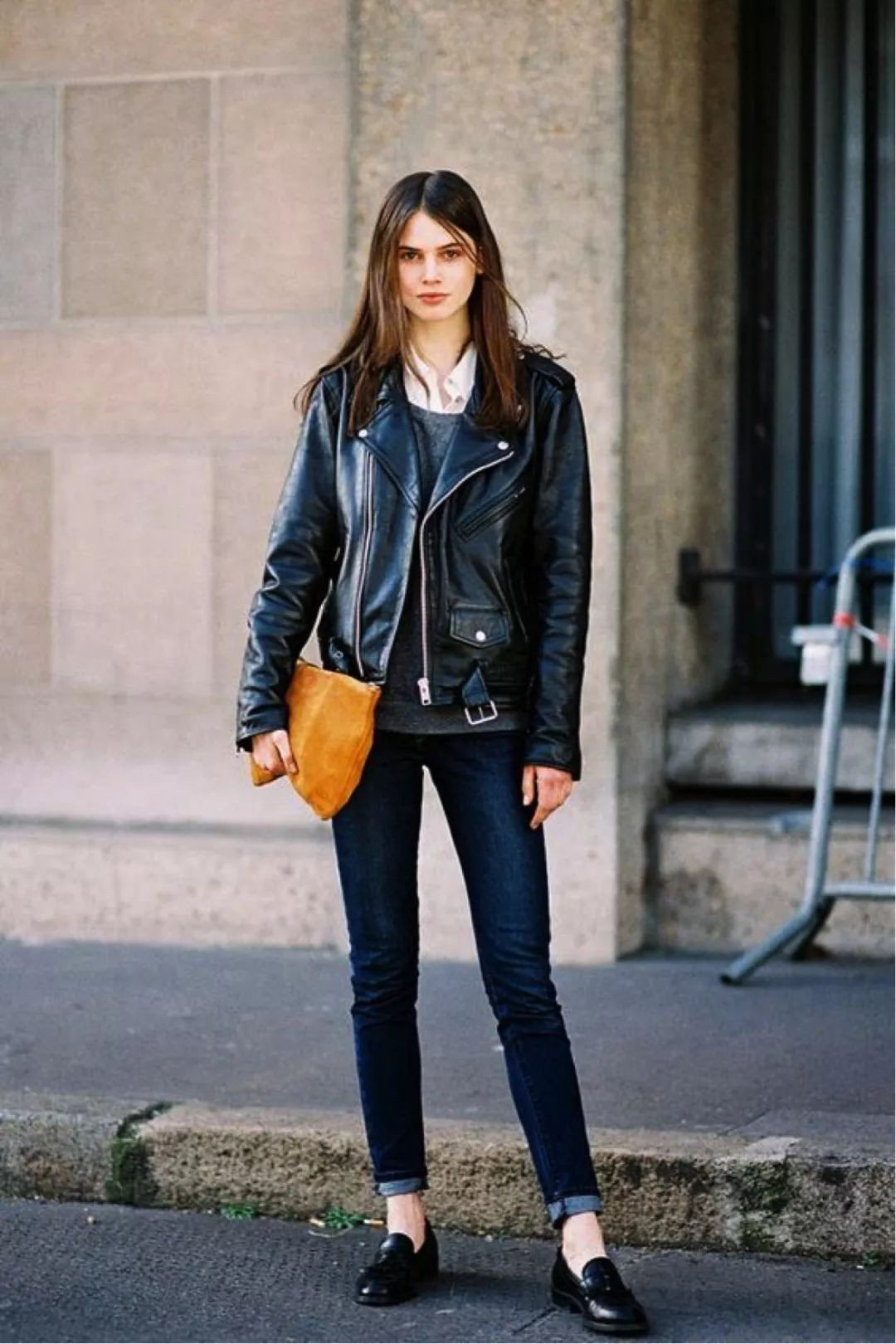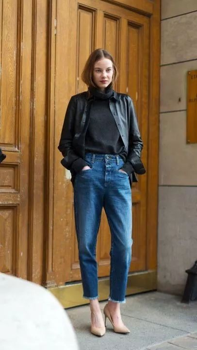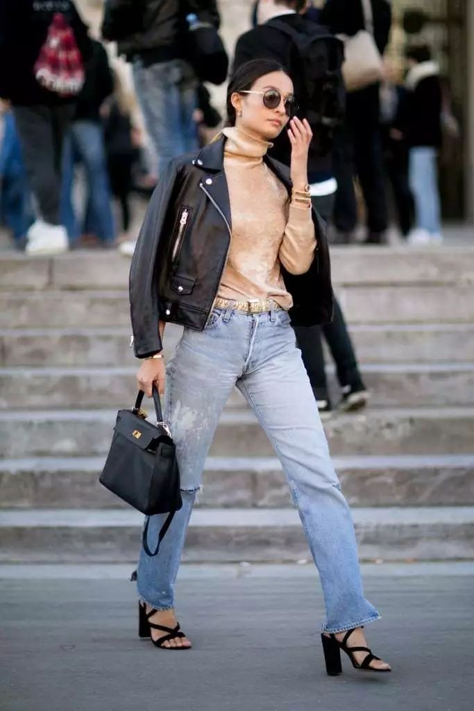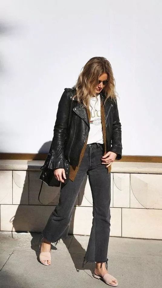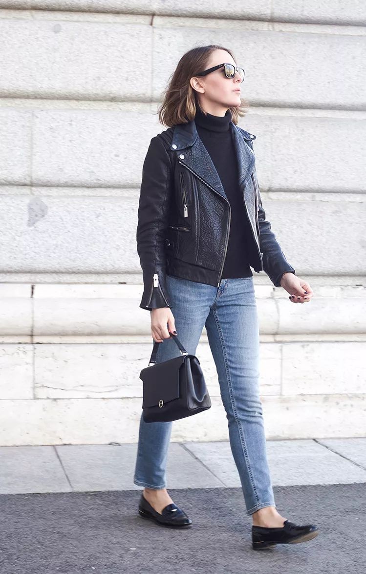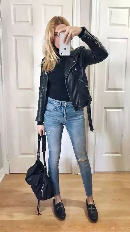 日常出行选择牛仔裤加一双平底鞋,为黑色皮夹克增添几分休闲随性的气息。