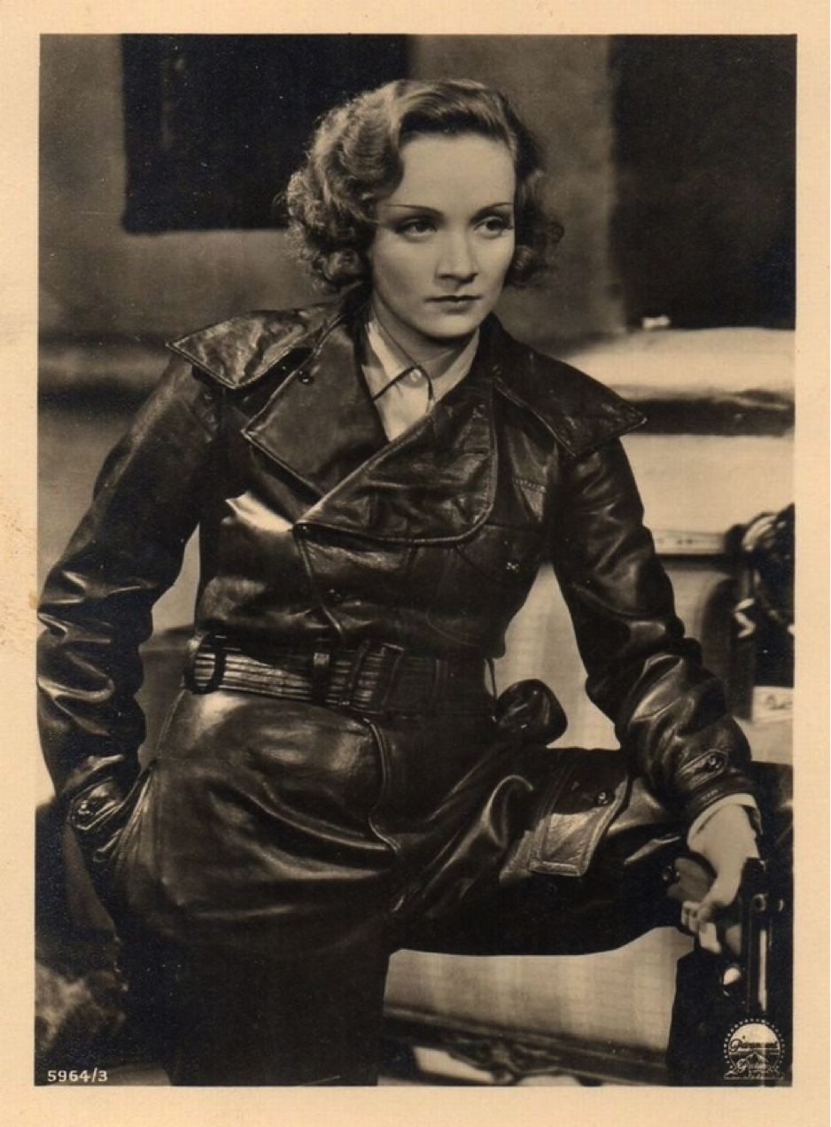 和风衣一样,黑色皮夹克的诞生与军装密不可分。一战期间,德国军方看中了皮革面料防风、保暖、强韧的特性,为飞行员们定制了一批皮夹克。1931年,德国女演员Marlene Dietrich在电影《声名狼藉》中身穿黑色皮夹克的形象深入人心,使得黑色皮夹克在普通百姓中慢慢普及开来。