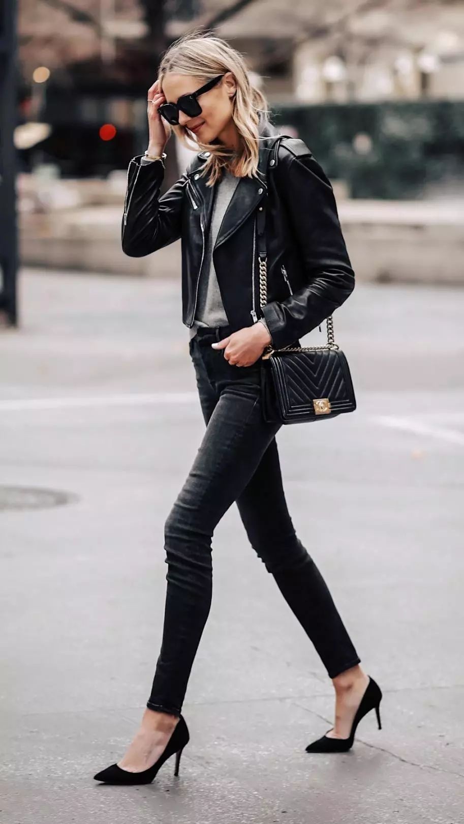 黑色皮夹克+牛仔紧身裤+板鞋是一个绝对不会出错的套路,无需搭配任何繁琐的配饰就可以实现effortless chic。