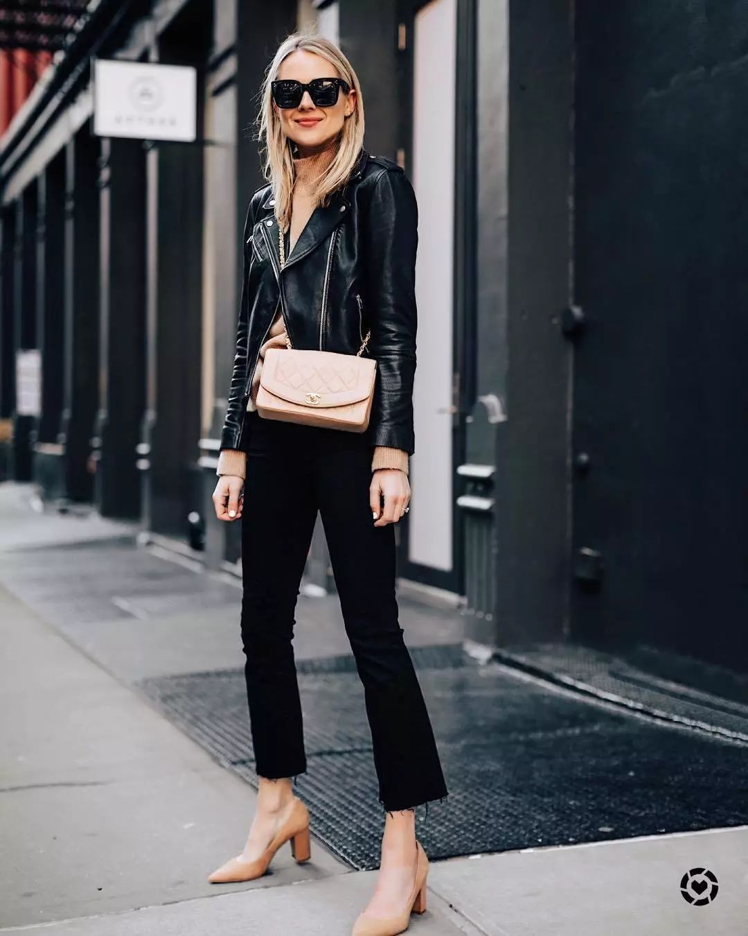 /// 黑色皮夹克+高跟鞋