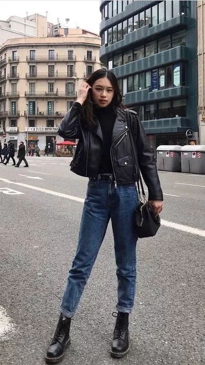 酷酷的机车女孩一定会选择黑色皮夹克+马丁靴全套,完美诠释什么叫自由不羁的灵魂。