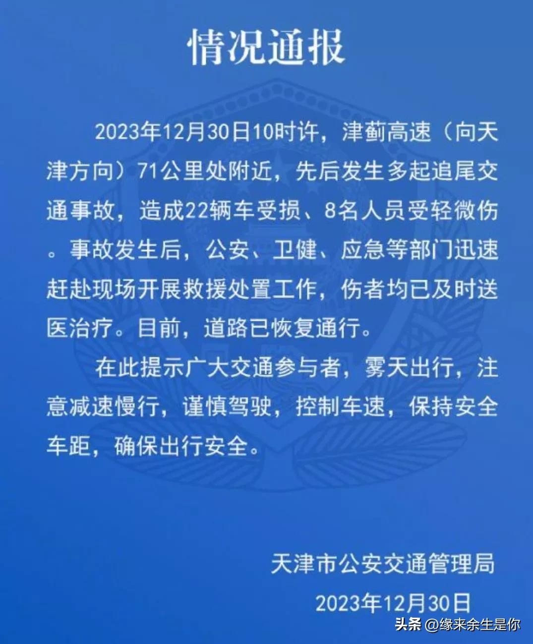 在1个小时前,天津市公安交通管理局,对此次交通事故发出通报: