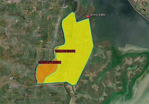 从地图上看,团洲垸区地势较为平坦,西南区域较高,推测出可能最先淹没区域和可能的最多淹没范围。(以上分析的可能淹没范围,仅通过地图影像和新闻消息推测,并未经过证实,请谨慎参考)
