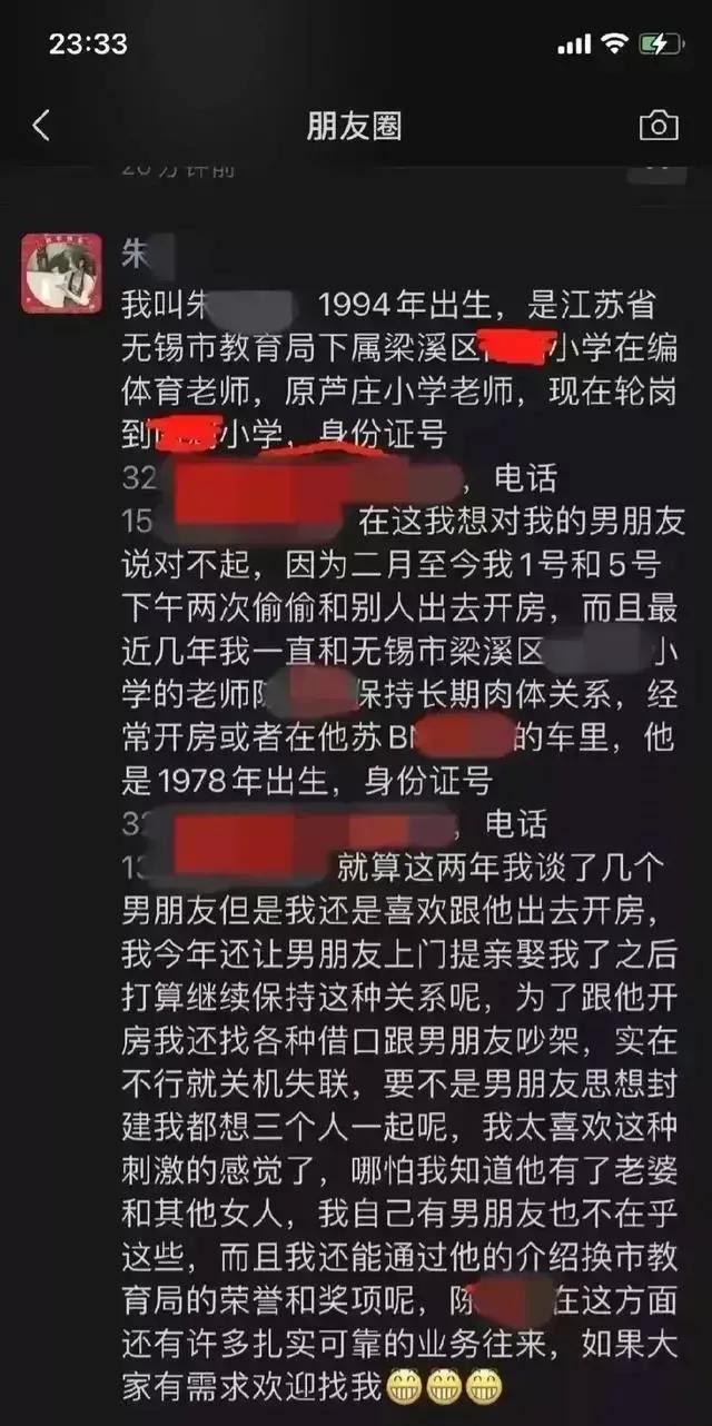 一个女老师,主动炫耀自己当“小三”,梦想着老公情人“三人行”。为了证明真实性,她自己在朋友圈公开自己的详细信息,言语污秽,行为下作不以为耻,反以为荣,令人咋舌。