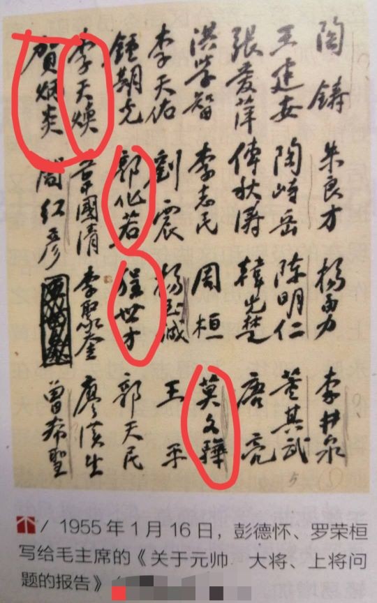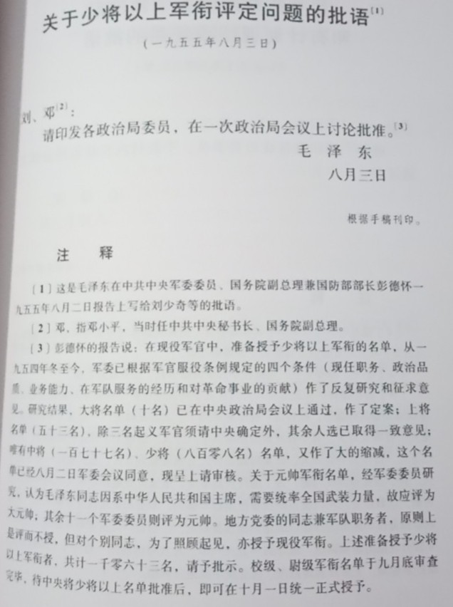 "…从一九五四年冬至今,军委已根据军官服役条例规定的四个条件(…)作了反复研究和征求意见。研究结果,……唯有中将(一百七十七名)、少将(八百零八名)名单,又作了大的缩减,这个名单已经八月二日军委会议同意,现呈上请审核。…"。