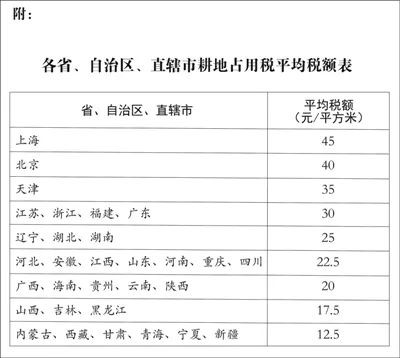 各地区耕地占用税的适用税额,由省、自治区、直辖市人民政府根据人均耕地面积和经济发展等情况,在前款规定的税额幅度内提出,报同级人民代表大会常务委员会决定,并报全国人民代表大会常务委员会和国务院备案。各省、自治区、直辖市耕地占用税适用税额的平均水平,不得低于本法所附《各省、自治区、直辖市耕地占用税平均税额表》规定的平均税额。