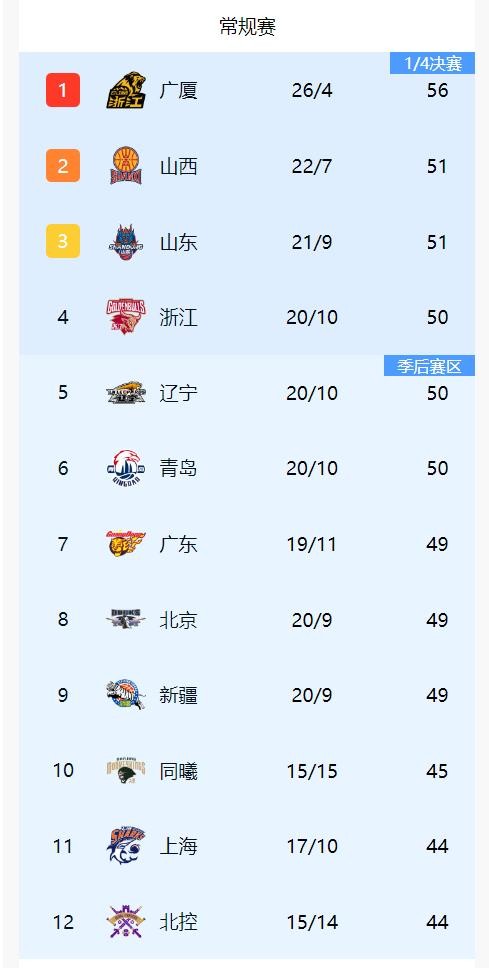 CBA一夜大变! 随着广厦4分险胜, 山东大胜32分, 新格局形成, 排名如下