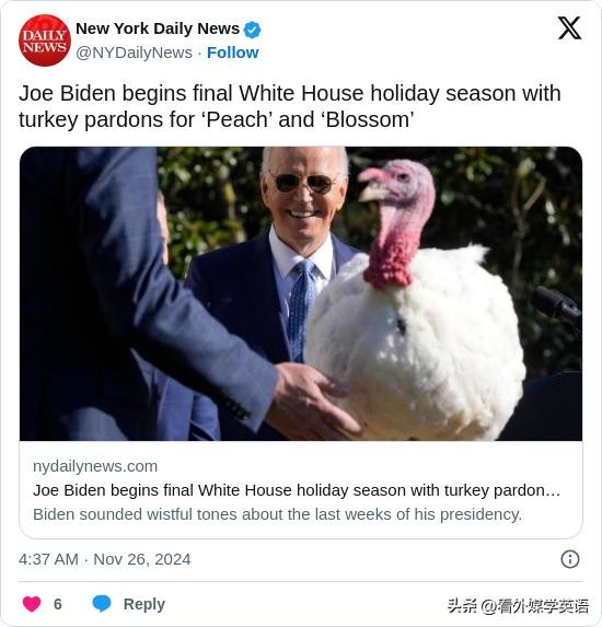 原文:Joe Biden begins final White House holiday season with turkey pardons for ‘Peach’ and ‘Blossom’