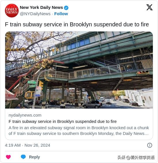 译文:布鲁克林F线地铁服务因火灾暂停。