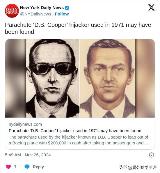 原文:Parachute ‘D.B. Cooper’ hijacker used in 1971 may have been found