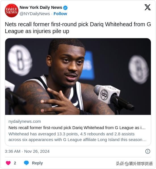 译文:随着伤病不断增加,篮网将前首轮秀达里克·怀特黑德从发展联盟召回。