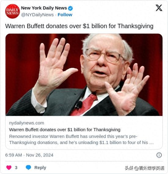 原文:Warren Buffett donates over $1 billion for Thanksgiving