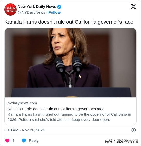 译文:卡玛拉·哈里斯并未排除竞选加州州长的可能性。